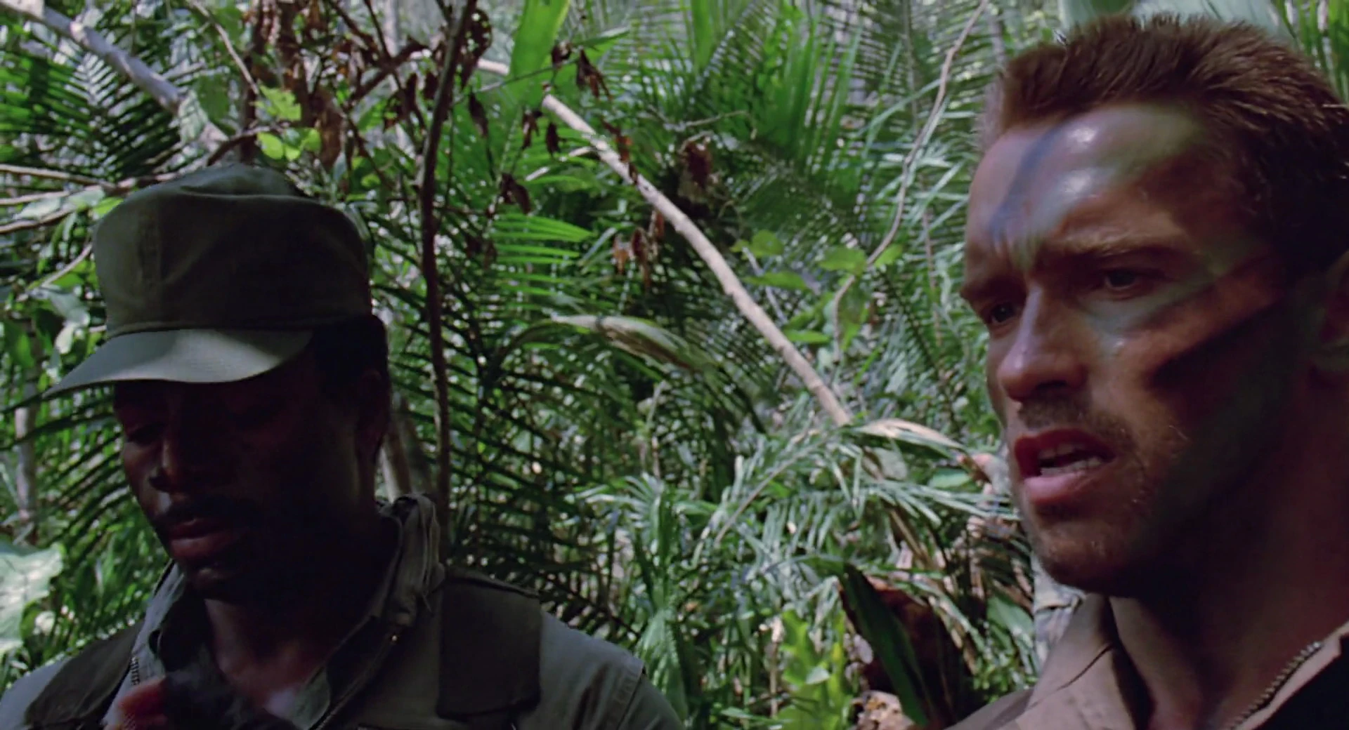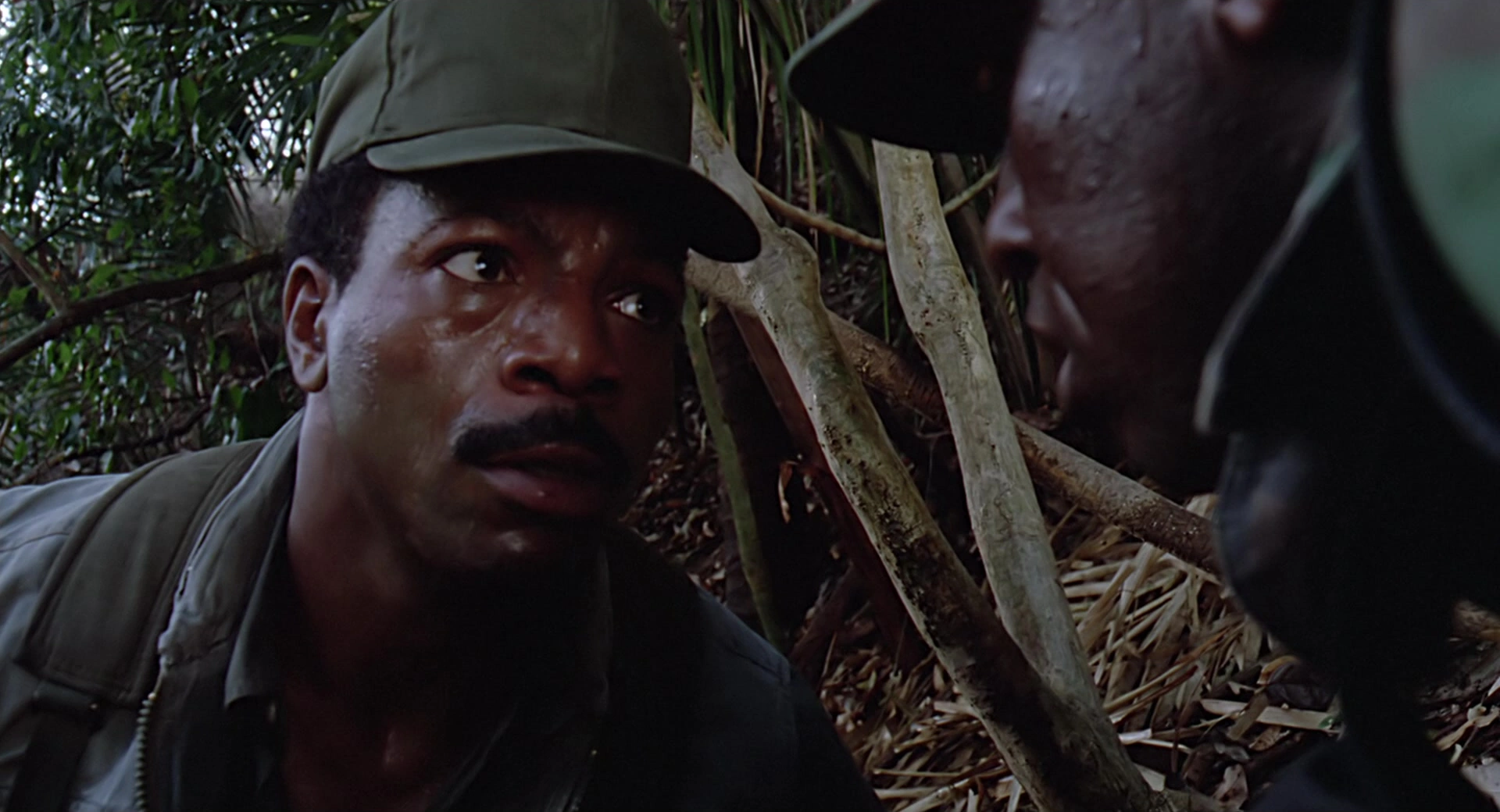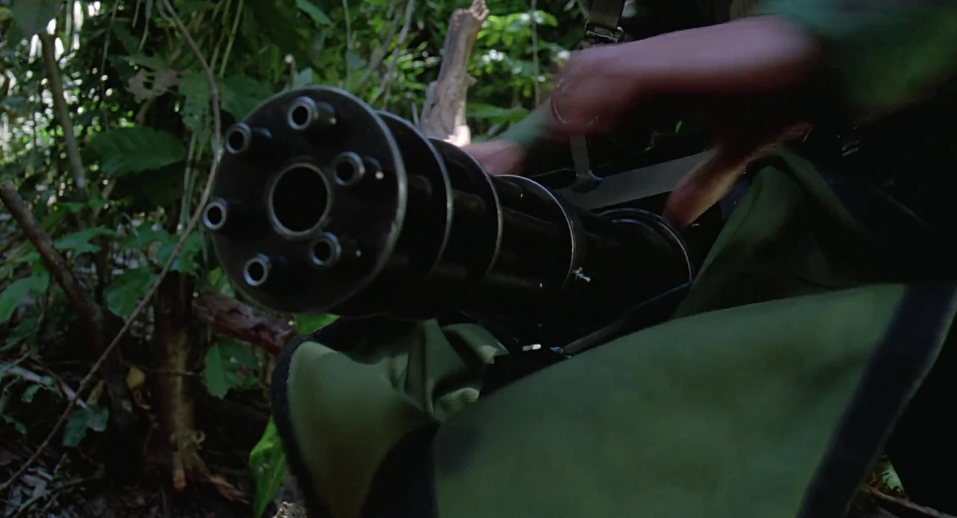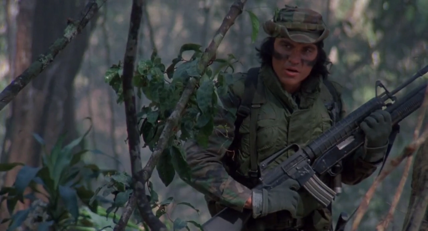 Following the trail they hear sound of people, they realise they are Rebels, Billy get up hiding, Dutch ordened the group stay hide and still, he give his riple M16 with M203 grenade launcher to Poncho, Poncho give him binoculars and moved lying down, as approach get up a litte and see a